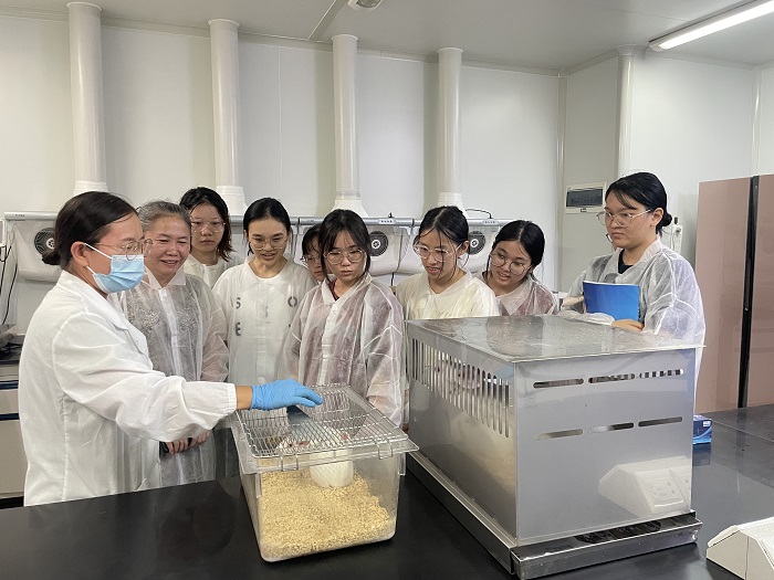 在GLP动物实验室赵映淑老师向同学们介绍实验动物(热农学院供图)