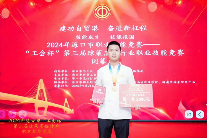 9月21日至22日,2024年海口市职业技能竞赛—“工会杯”第三届琼菜烹饪行业职业技能竞赛在海南省农业学校举办。我校旅游学院烹饪工艺与营养专业学生周平荣获中式烹调项目第一名金奖。