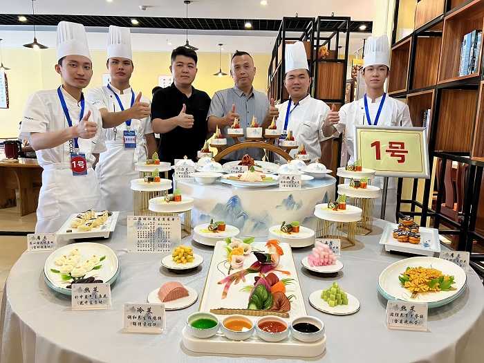 高职组烹饪赛项宴席设计与制作竞赛内容包括基本功、宴席设计书、宴席制作(现场操作和菜品质量)和宴席展评(宴席展示、陈述和答辩)四个部分。经过激烈角逐,我校参赛选手凭借扎实的基本功、沉着的临场发挥和良好的团队协作,最终取得大赛团体银奖的好成绩。