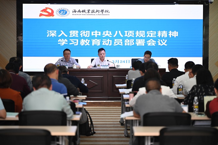 3月24日,我校党委召开深入贯彻中央八项规定精神学习教育部署会,深刻领悟习近平总书记关于深入贯彻中央八项规定精神学习教育的重要讲话和重要指示精神,传达学习中央党的建设工作领导小组会议和《中共中央办公厅关于在全党开展深入贯彻中央八项规定精神学习教育的通知》精神,贯彻落实省委常委会会议暨省委党的建设工作领导小组会议精神、海南省委教育工委会议精神,启动部署全校学习教育工作。校党委书记周炳才出席会议并讲话。校党委委员,校长助理沈振国主持会议