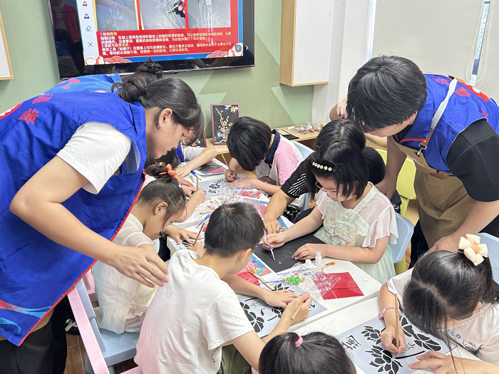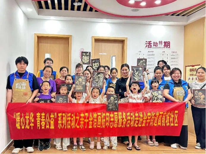 在“金箔流光绘传承”的实践创作环节,志愿者和孩子们一起细心拆解金箔画制作流程,从“画”“涂”“贴”“扫”四个关键步骤入手,向孩子们讲解每个环节的操作要点和示范,孩子们迫不及待地拿起工具,与家长携手开启创意手工之旅?;疃殖∑杖攘遥⒆用亲ㄗ⒋醋鞯纳碛坝爰页はば闹傅嫉奈萝盎?,构成生动的非遗传承图景。