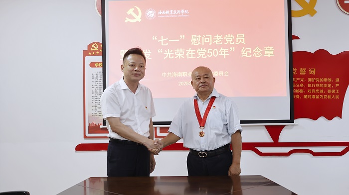 仪式上,学校党委书记周炳才为党龄满50年的我校退休党员林虎、韩能光颁发“光荣在党50年”纪念章,并代表学校党委向两位老党员致以诚挚祝贺与崇高敬意。他表示,老党员是学校发展的奠基者、亲历者和推动者,用汗水与热血践行了对党的忠诚,为学校建设和职业教育事业发展立下汗马功劳,这枚纪念章不仅是荣誉,更是精神火炬,激励着新一代党员接续奋斗。