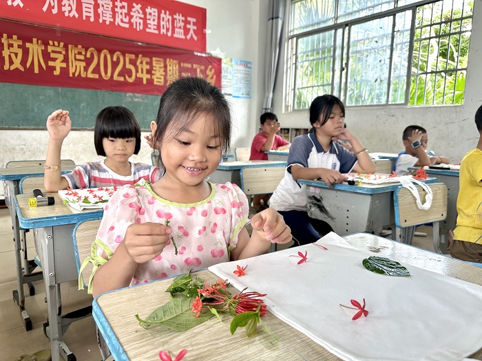 这已经是海南职业技术学院艺术学院的“蒲公英”团队连续第7年来到新园村小学开设艺术课堂,每年的暑假,这里的孩子们都会翘首以盼,他们会不停地询问老师“蒲公英”为啥还没来、到底啥时候能来呀。目前,蒲公英们已累计为400多名孩子提供了艺术启蒙,从非遗漆艺到AI绘画,从自贸港主题绘画到校园地面墙绘,从普通话朗诵到家长走访,这场跨越传统与现代、艺术与科技的支教实践,不仅为新园村的孩子打开了美育的新窗口,更在互动中书写了一段双向奔赴的温暖故事。